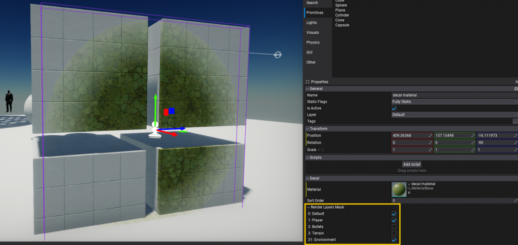 Another big feature in this release is a per-pixel objects masking in shaders via stencil buffer. This gives us ability to mask decals based on the object undermeath. Such feature allows to draw bullet hole decals only on environment, detail terrain surface with wet puddle decals that won’t affect other nearby objects by using masking. Post Process shaders can access this data too for creating object outlines or highlights.